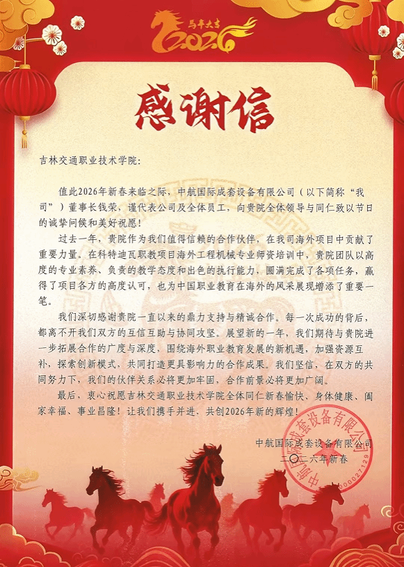 信中,中航国际成套设备有限公司对我校团队以高度的专业素养、负责的教学态度和出色的执行能力表示了高度认可。展望新年,双方将进一步拓展合作的广度与深度,围绕海外职业教育发展的新机遇,加强资源互补,探索创新模式,共同打造更具影响力的合作成果。