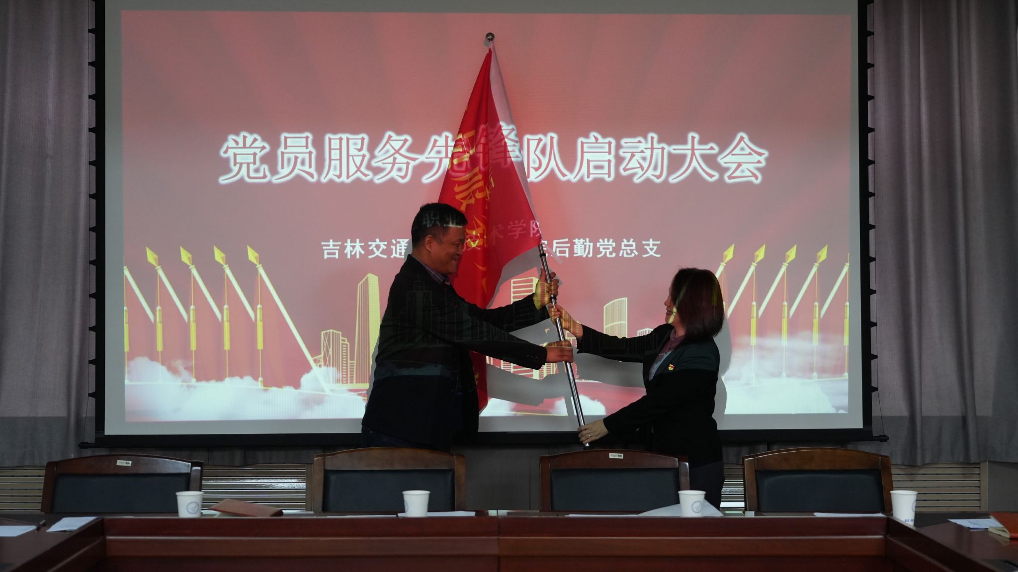 仪式现场,程敬松为先锋队授旗,标志着后勤党员服务队伍正式履职启航。