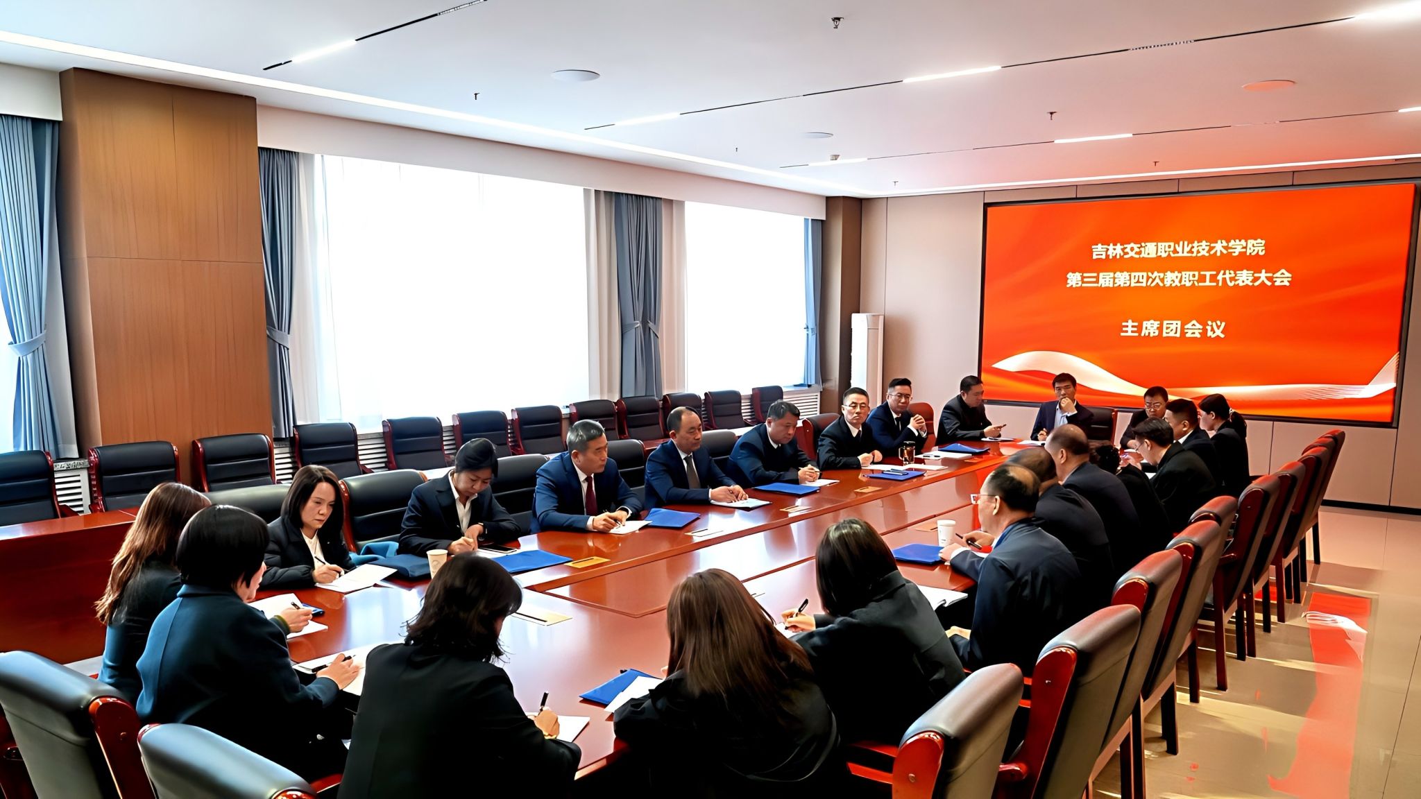 为切实保障广大教职工民主参与、民主管理、民主监督权利,4月15日,我校第三届第四次教职工代表大会在学校知行楼4401会议室召开。学校党委书记于繁华、党委副书记赵剑辉、纪委书记袁洪亮、副院长孟凡成、副院长方健参加大会,与全体教职工代表齐聚一堂,全面总结学校年度发展成果,科学谋划未来工作部署,共商学校“十五五”事业发展大计,共绘育人事业发展蓝图。大会由党委副书记赵剑辉主持。