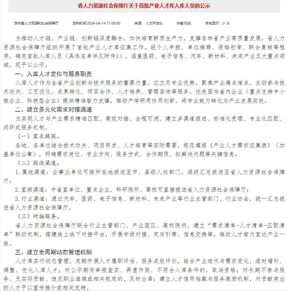 吉林首批产业人才库征集工作,是省人力资源社会保障厅推动人才链、产业链、创新链深度融合,加快培育新质生产力,汇聚高端智力、搭建人才桥梁,支撑吉林省产业高质量发展的重要举措。此次学校多名教师入选,既是对入选教师个人专业能力与综合素养的高度认可,也是学校长期坚持人才强校战略、深化产教融合、聚焦专业建设与人才培育的重要成果,充分展现了我校在助力地方产业高质量发展中的人才优势与责任担当。