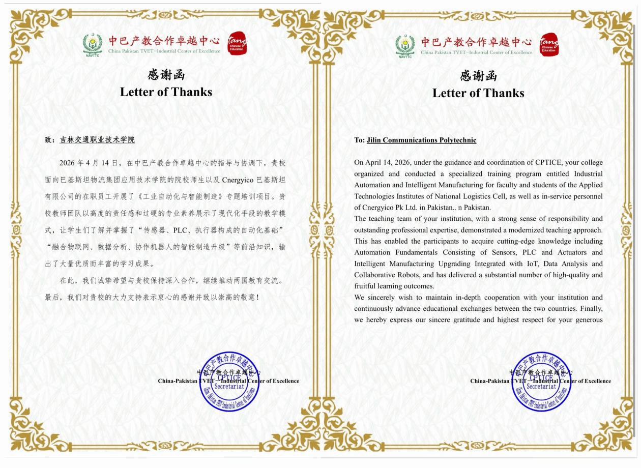 4月21日,我校收到中巴产教合作卓越中心(CPTICE)专门发来的感谢函,对学校4月14日圆满完成“工业自动化与智能制造”巴基斯坦专题培训表示诚挚感谢与高度认可。