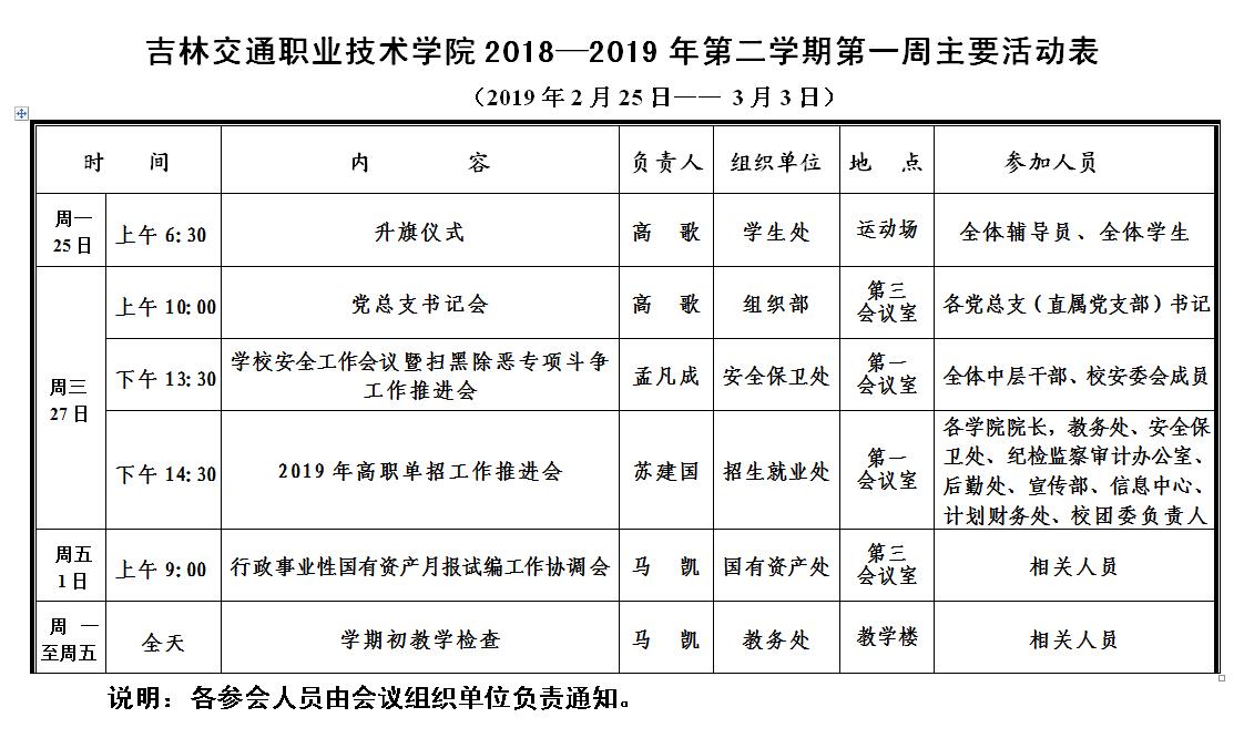 吉林交通职业技术学院2018—2019年第二学期第一周主要活动表