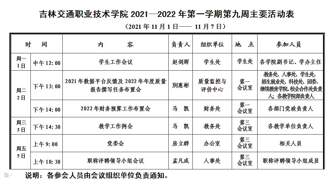 吉林交通职业技术学院2021—2022年第一学期第九周主要活动表