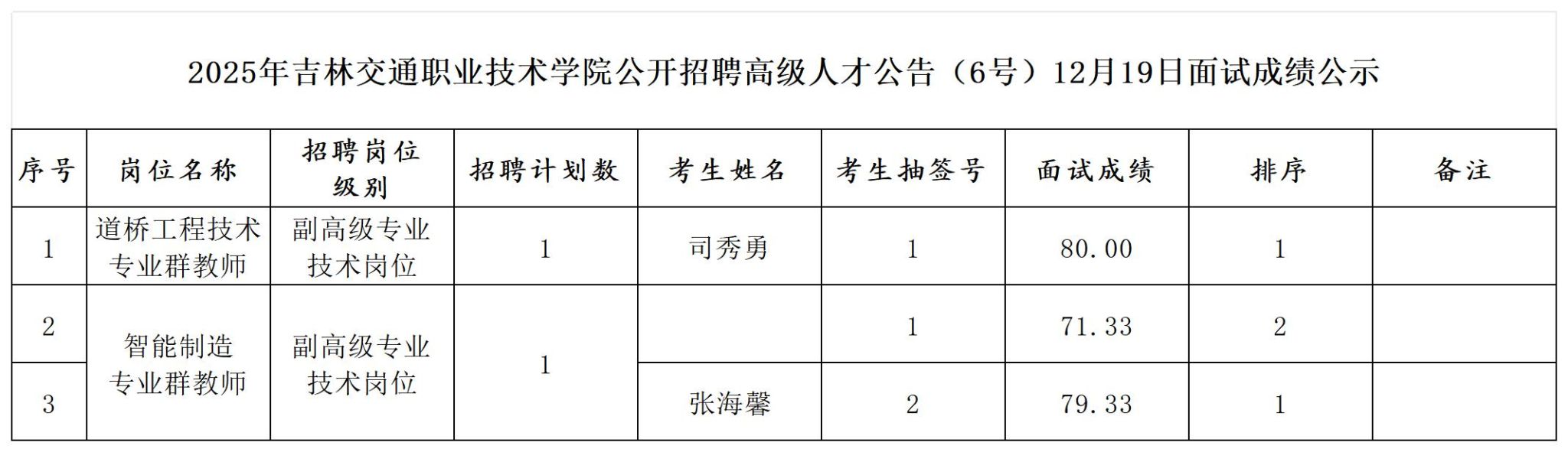 根据2025年吉林交通职业技术学院公开招聘高级人才公告(6号)有关规定,现将12月19日面试结果进行公示,公示期为5个工作日,自2025年12月19日至2025年12月25日。