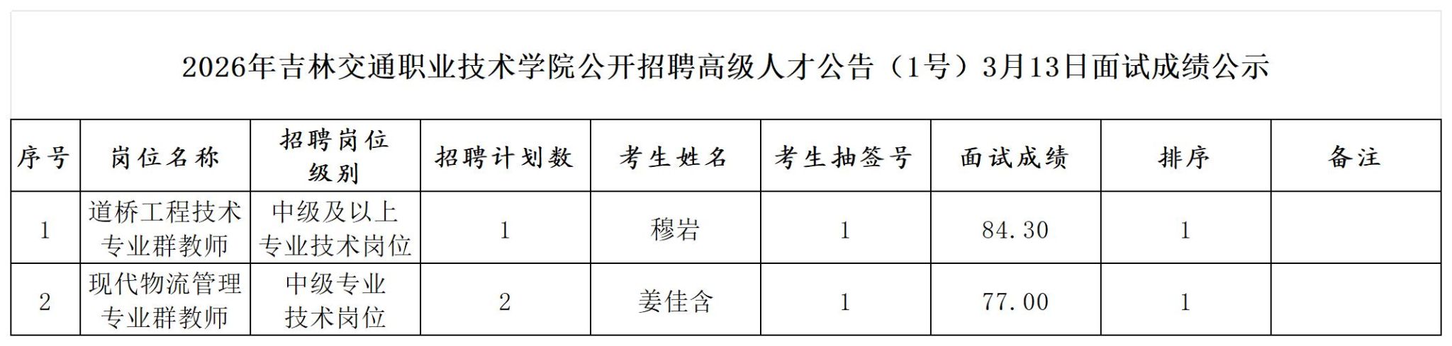 根据2026年吉林交通职业技术学院公开招聘高级人才公告(1号)有关规定,现将3月13日面试结果进行公示,公示期为5个工作日,自2026年3月13日至2026年3月19日。