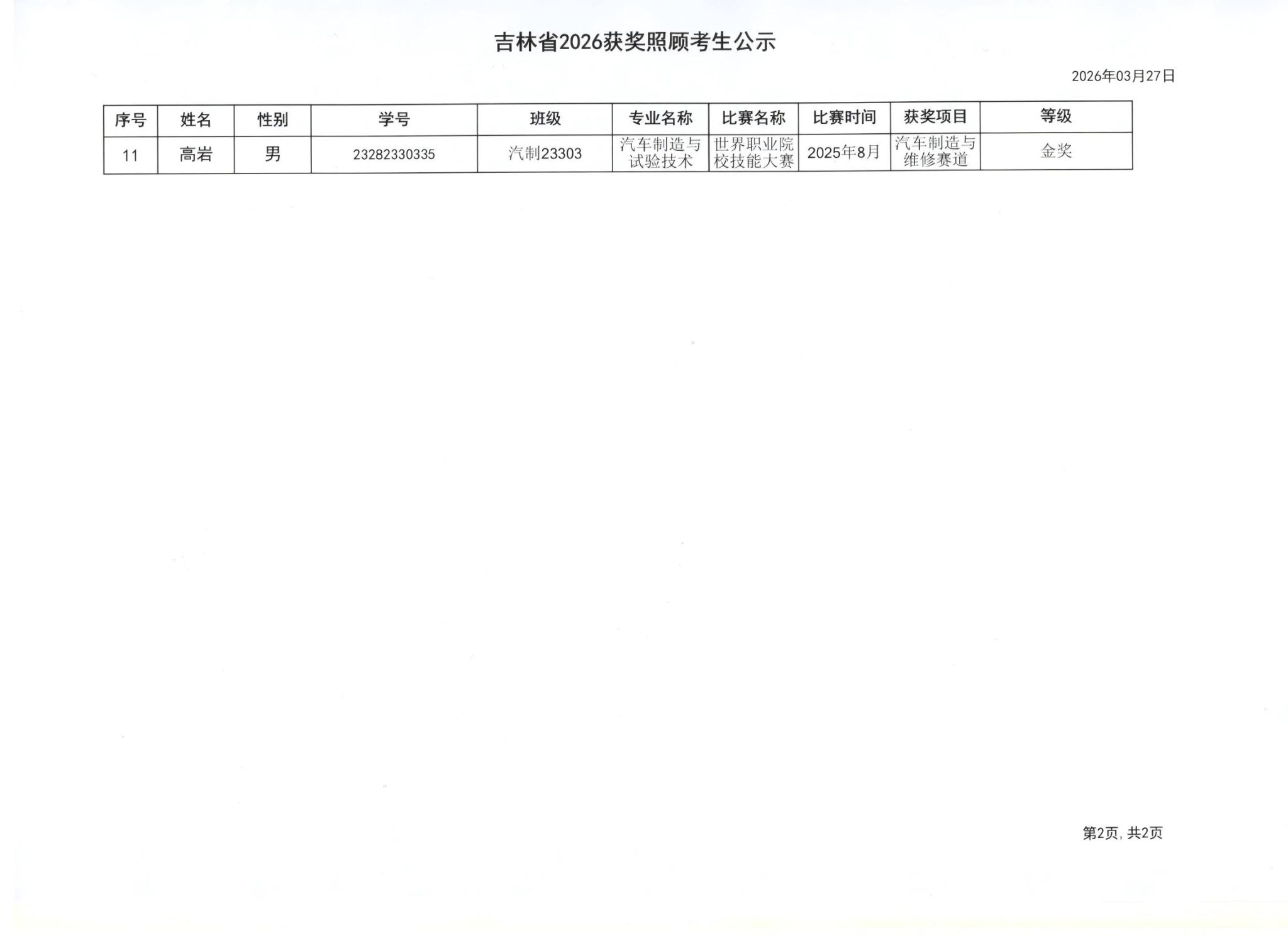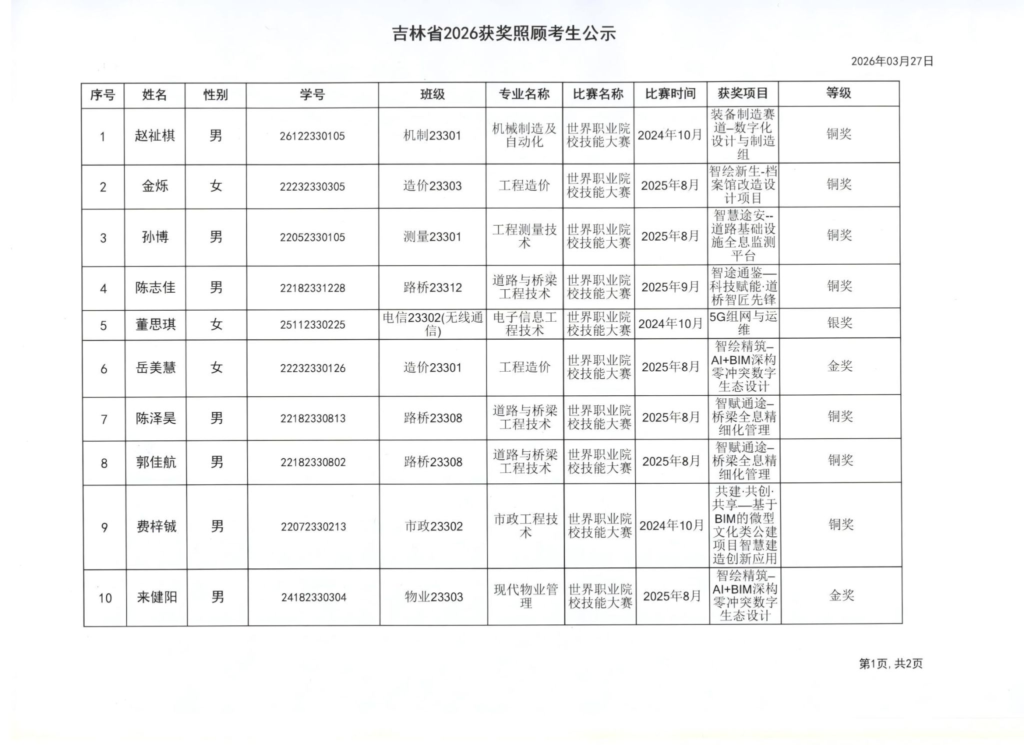 根据吉林省教育考试院《关于做好吉林省2026年普通高等学校专升本考试招生工作的通知》(吉教考(2026)12号)文件有关规定,现将我校符合2026年专升本获奖照顾考生名单予以公示,详细名单如下。