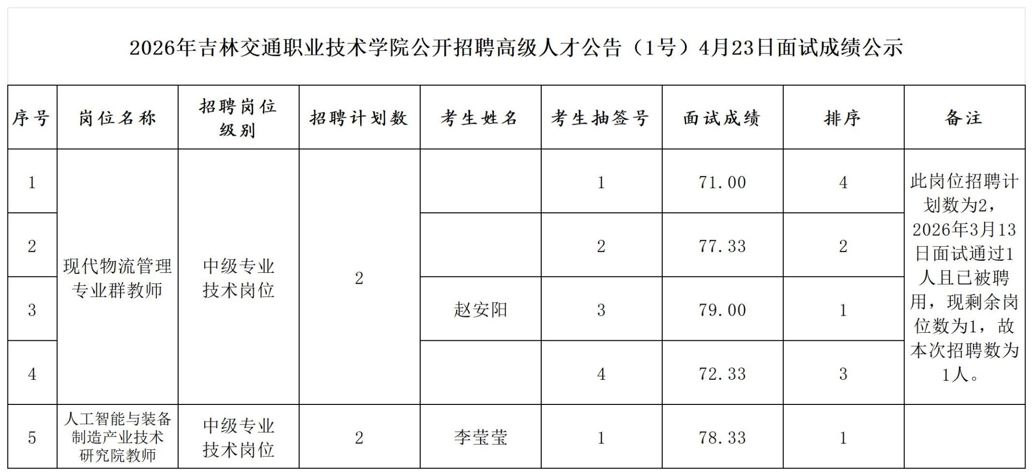 根据《2026年吉林交通职业技术学院公开招聘高级人才公告(1号)》有关规定,现将4月23日面试结果进行公示,公示期为5个工作日,自2026年4月23日至2026年4月29日。