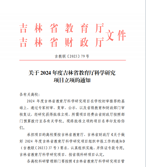 根据吉林省教育厅财政厅《关于2024年度吉林省教育厅科学研究项目立项的通知》(吉教联[2023]79号),我校共获批21个项目,资助经费31.5万元。资助经费、立项总数再创历史新高,蝉联全省高职院校首位。
